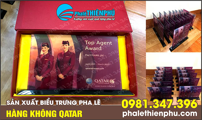 Xưởng pha lê Thiên Phú tự hào sản xuất biểu trưng pha lê hãng máy bay qatar airlines.
